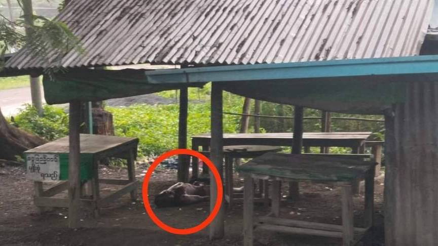 ပုံစာ - လက်ဖက်ရည်ဆိုင်အတွင်းတွင်တွေ့ရသည့် ကိုထွန်းမင်းလတ် (ခ) ဗိုလ်ရူး၏ အလောင်း။